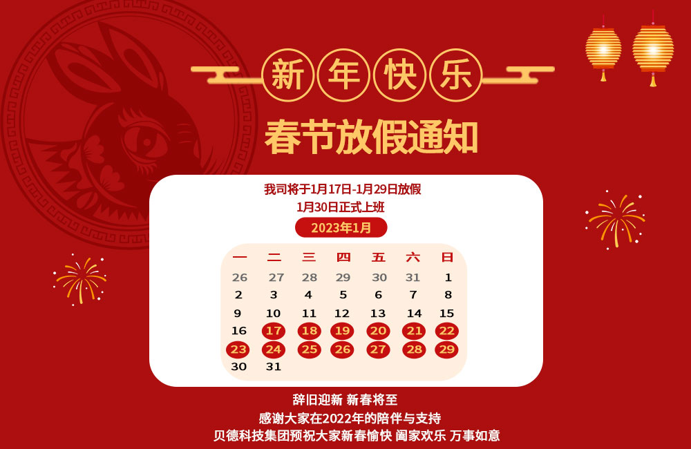公司于2023年1月17日(農歷臘月二十六)—2023年1月29日(正月初八)放假,2023年1月30日(正月初九)開工上班。