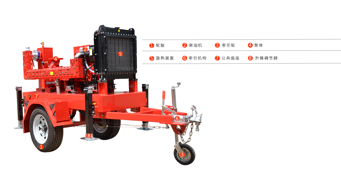 1.單級(jí)式移動(dòng)泵車主要由真空輔助裝置、柴油機(jī)動(dòng)力包、柴油機(jī)專用油箱、泵傳動(dòng)系統(tǒng)、設(shè)備底座、自吸泵總成、防雨設(shè)施、起動(dòng)裝置、起動(dòng)電源裝置、進(jìn)水管總成、出水管總成、二輪移動(dòng)拖車系統(tǒng)、快速起吊裝置等組成。