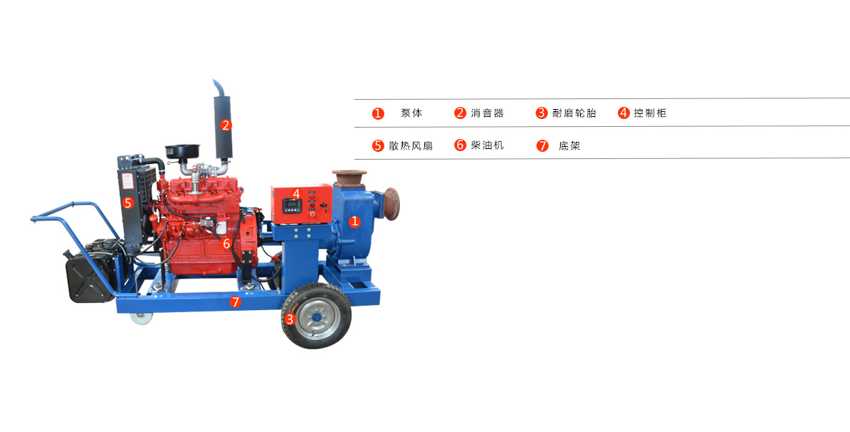 1.手推式強自吸移動泵車主要由真空輔助裝置、柴油機動力包、柴油機專用油箱、泵傳動系統(tǒng)、設(shè)備底座、自吸泵總成、防雨設(shè)施、起動裝置、起動電源裝置、進水管總成、出水管總成、二輪移動拖車系統(tǒng)、快速起吊裝置等組成。